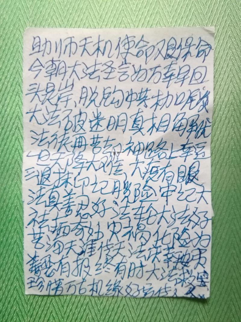 前几天在一个偶然的机会下我捡到了一份本地同修派发的手写真相资料(附有图片),是在停放的车辆上放置的。我拿起资料,前后左右的找寻同修的身影,却没看到一个象同修的人。