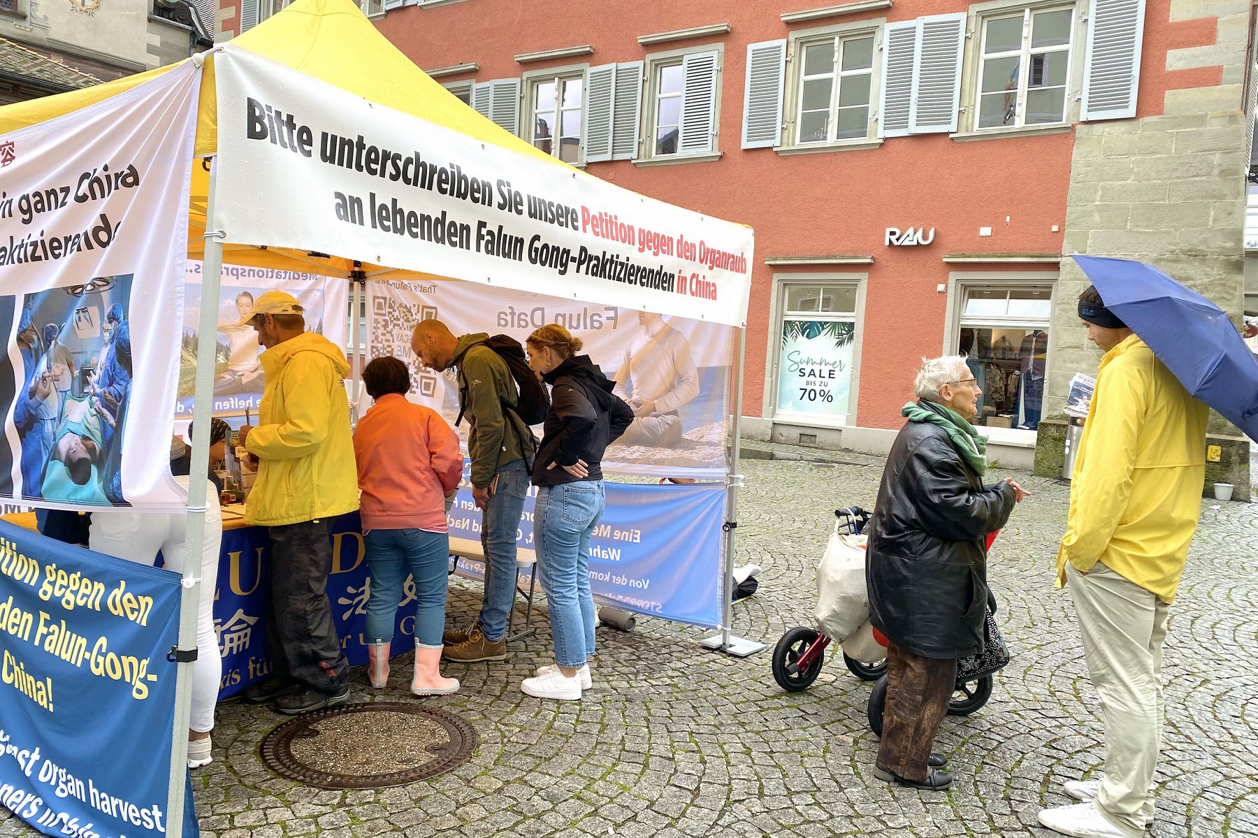 一对德国夫妇斯特凡(Stefan)与布里塔(Britta)跟法轮功学员交谈之后,双双签名声援法轮功学员反迫害。