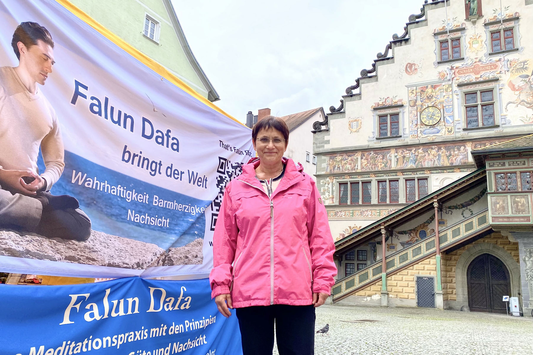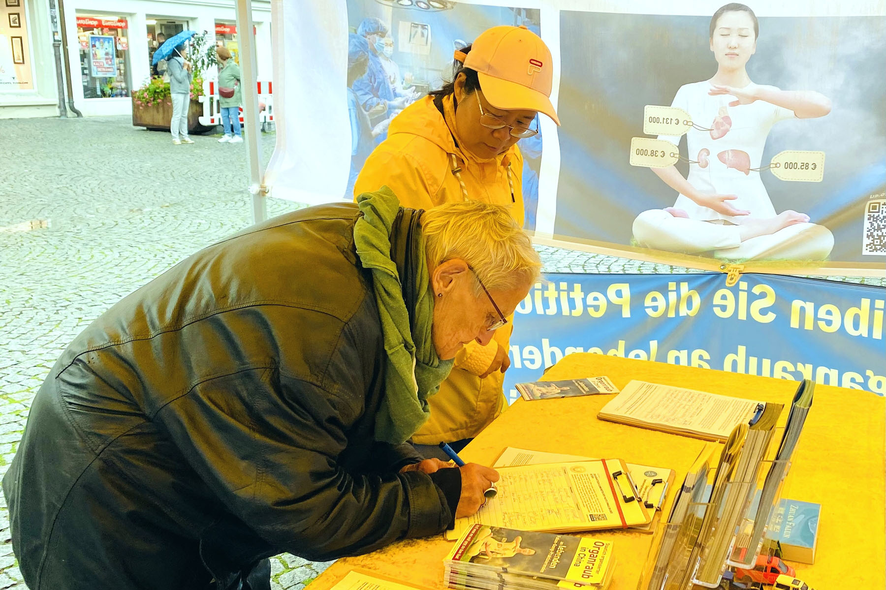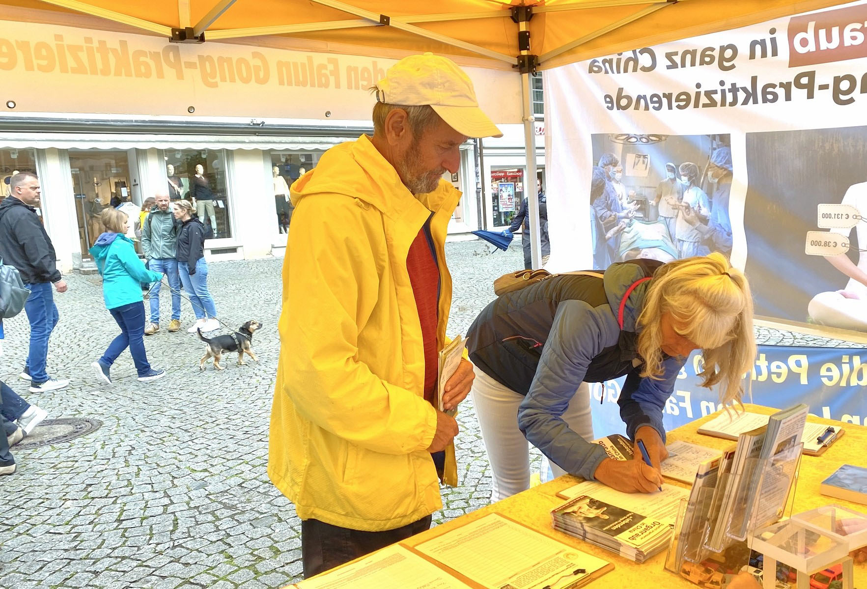 来自柏林附近的萨宾娜·亨尼格女士(Sabine Hennig)看到法轮功学员的活动后,停下脚步与学员交谈了很久。她签名声援法轮功学员反迫害,并表示自己“反对不公正与虐待”。