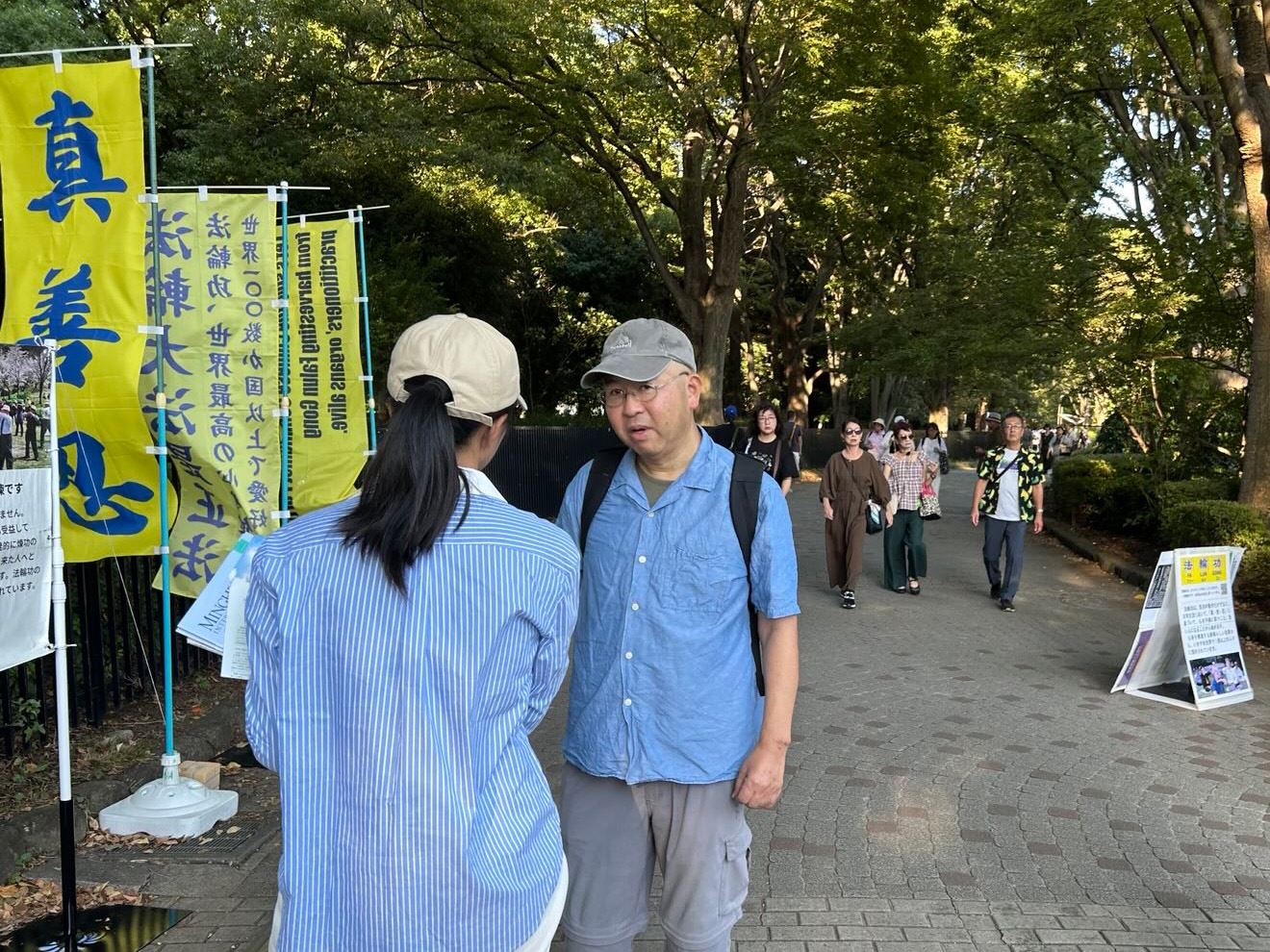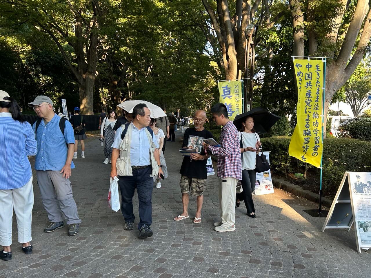 法轮功学员来到东京代代木公园设立真相展位,有不少从中日文化交流活动会场走出来的日本人来到展位前了解真相。