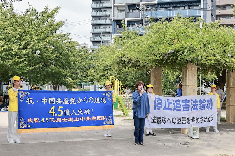 大阪市会议员木下吉信(Yoshinobu Kinoshita)在游行前的集会上发表鼓励致辞。他表示,必须让更多日本民众了解法轮功受迫害的现状。他说:“未来也会一直支持这一活动,希望有一天学员们的努力能够结出硕果,终结迫害,大家都能自由自在的修炼,并一起举杯庆祝这个伟大的时刻。”
