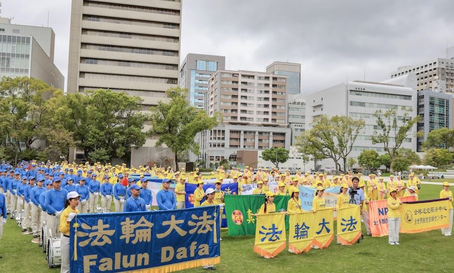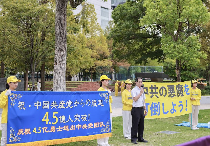 法轮大法学会会长稻垣(Inagaki)先生在集会上发言提到,万博会期间来自世界和全日本的人们齐聚关西,在此举办游行,向人们传播法轮功的真相。