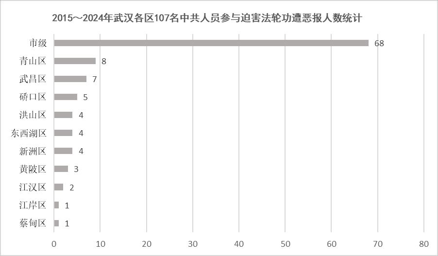武汉各区遭恶报人数多少由大到小依次为:市级68人,青山区8人,武昌区7人,硚口区5人,洪山区4人,东西湖区4人,新洲区4人,黄陂区3人,江汉区2人,江岸区1人,蔡甸区1人,共计107人。