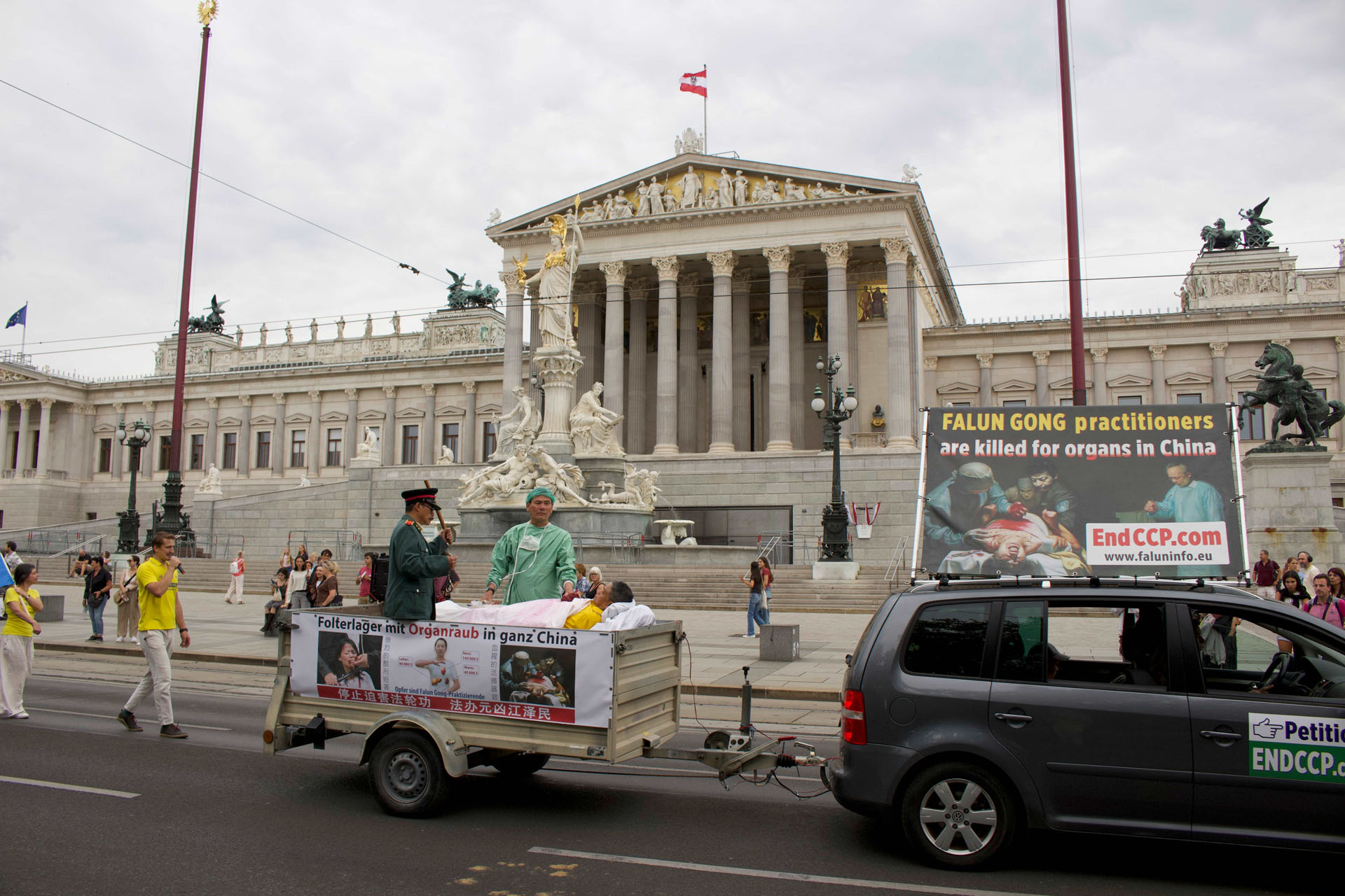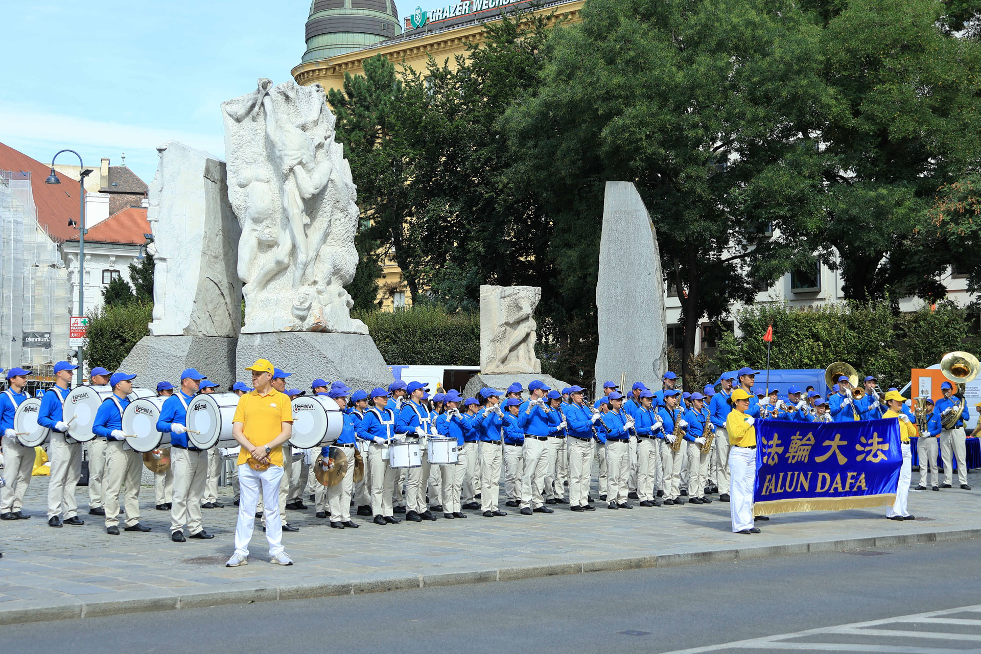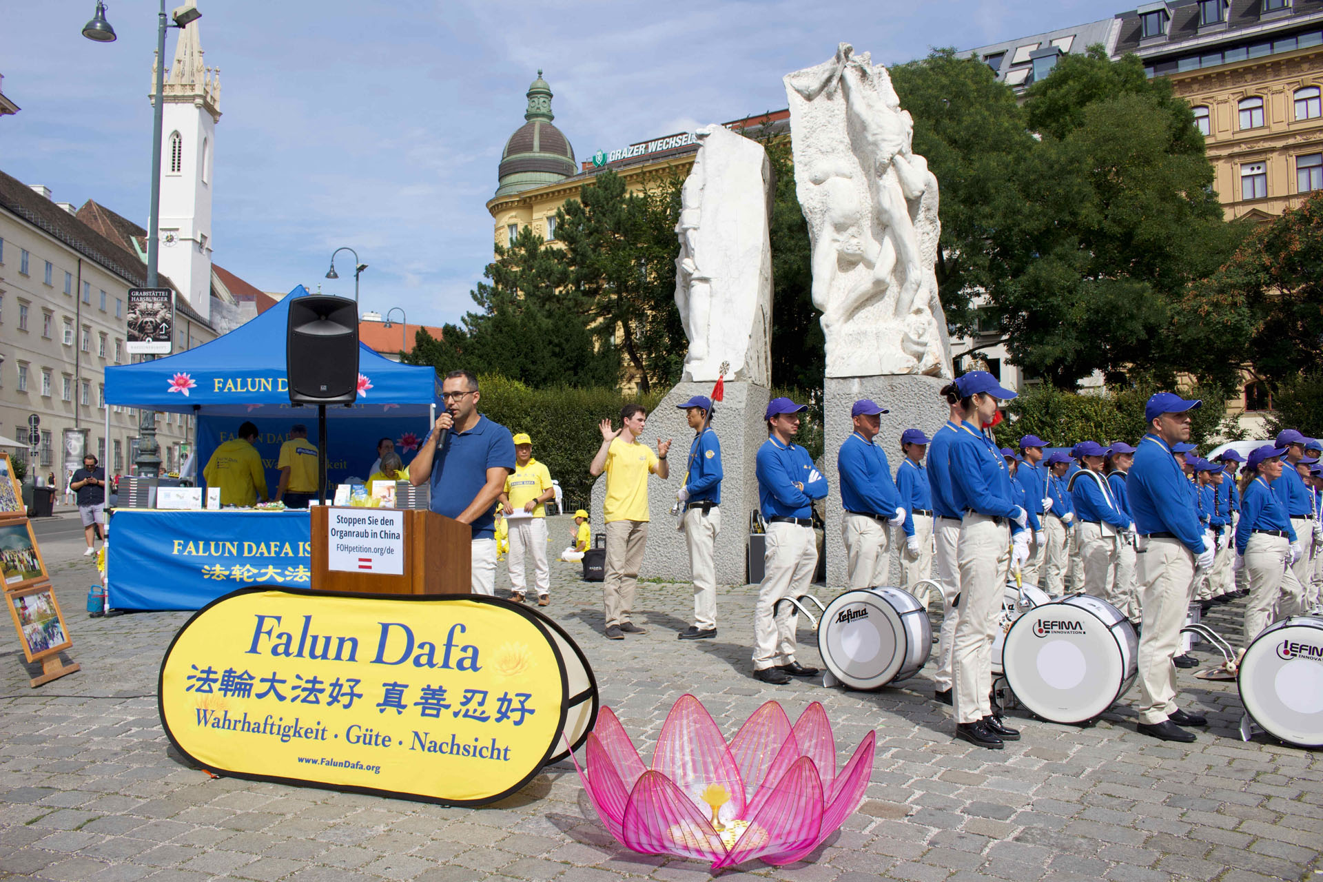 当天,法轮功学员在维也纳市中心赫尔穆特·齐尔克广场(Helmut-Zilk-Platz)举办了信息日活动,下午游行队伍从此广场出发,途经国家歌剧院,议会大厦,弗赖翁广场(Freyung)等著名景点,通过环城大道(Ringstrasse),格拉本大街(Graben)克恩滕大街(Kärntner Strasse)等购物步行街。
