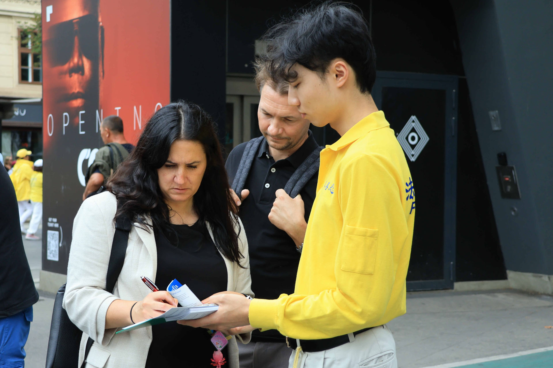 当天很多人是第一次听闻中共迫害法轮功,甚至活摘法轮功学员器官的罪行,他们在感到震惊之余,当即签名要求制止中共的罪行。