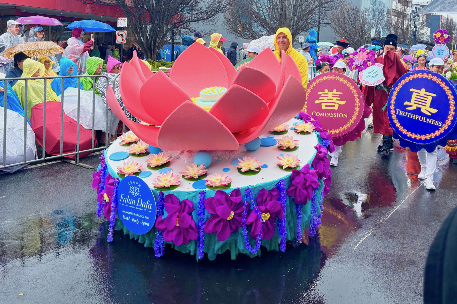 每年都应邀参加图文巴花节大游行的法轮功团体,是由法轮功学员组成的天国乐团、腰鼓队和身着各民族服饰、手持色彩缤纷的各种花饰的队伍。法轮功学员的游行队伍向广大民众展现着法轮大法的美好;天国乐团演奏的乐曲,气势磅礴、慈悲又祥和,一路上人们报以热烈的掌声和喝彩声。