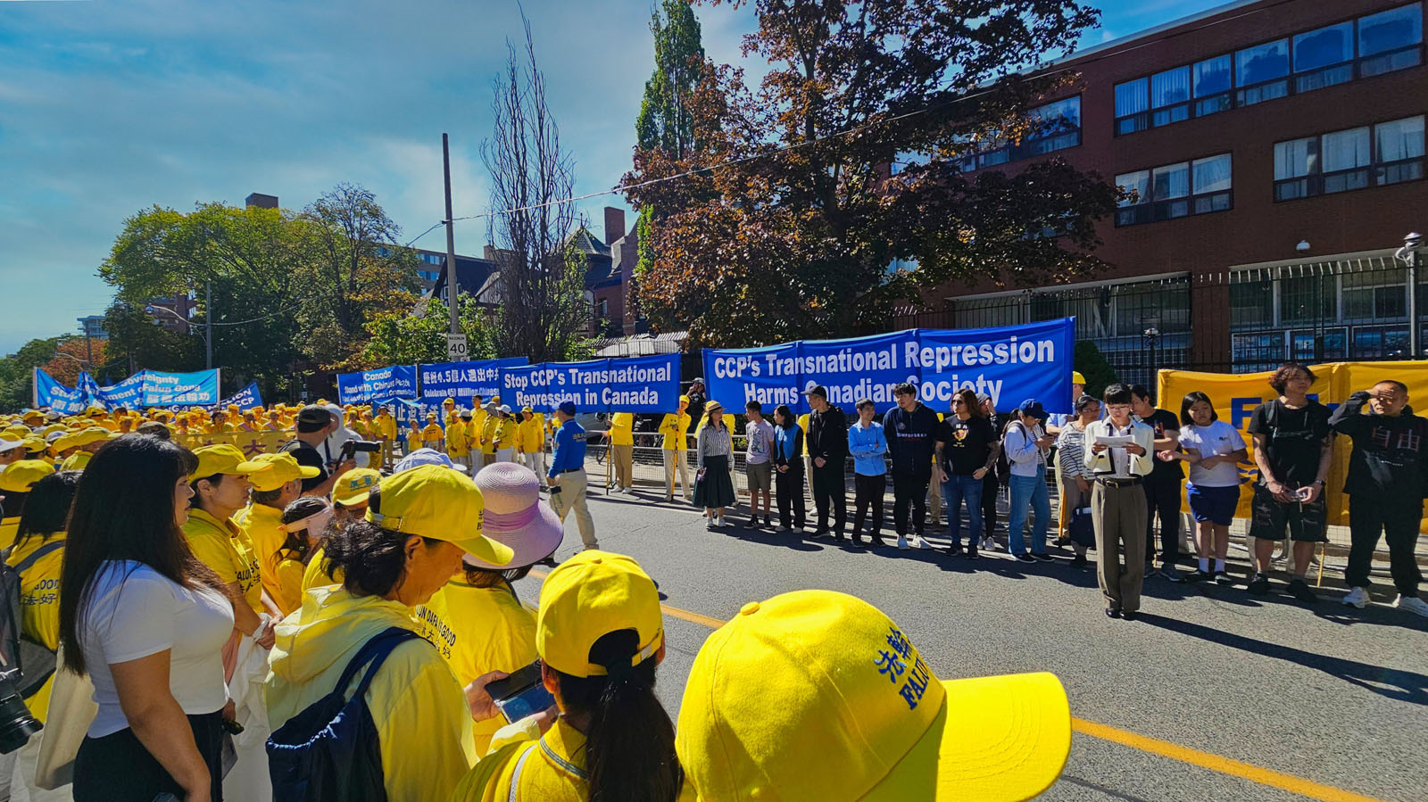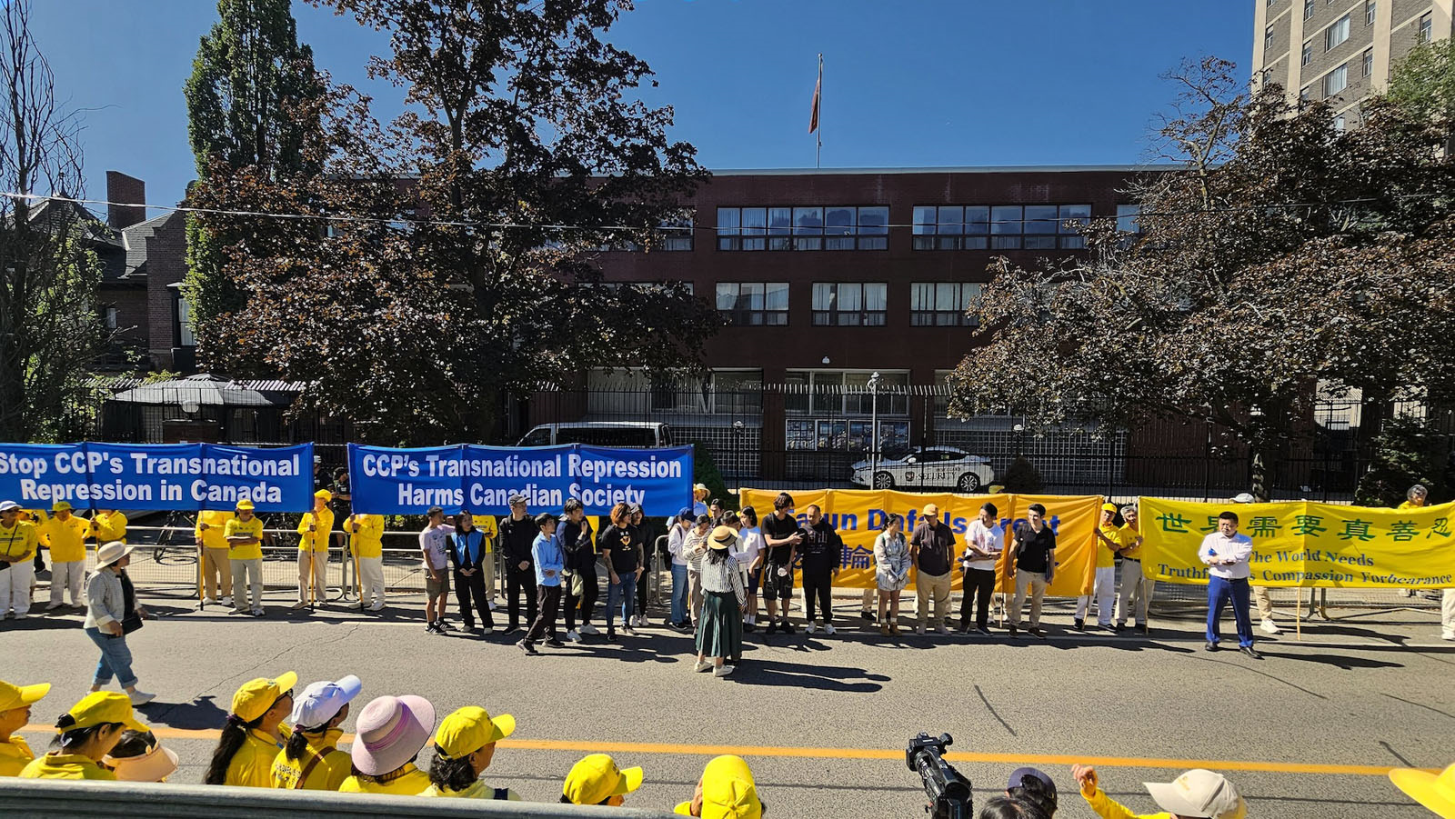 图1~3:二零二五年九月二十八日,多伦多部分法轮功学员及支持者在多伦多中领馆前集会,呼吁制止中共跨国镇压法轮功,呼吁中共停止迫害法轮功。