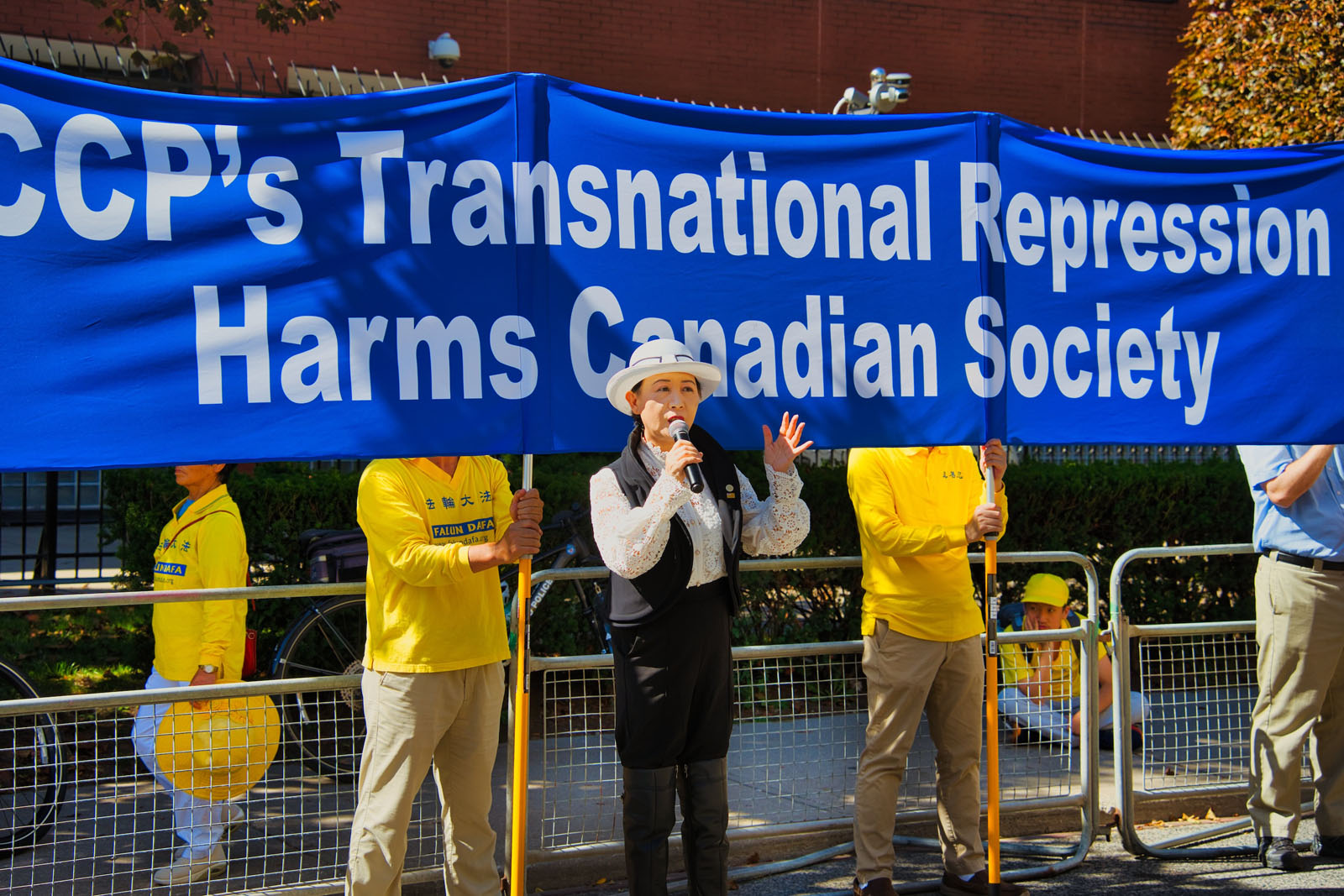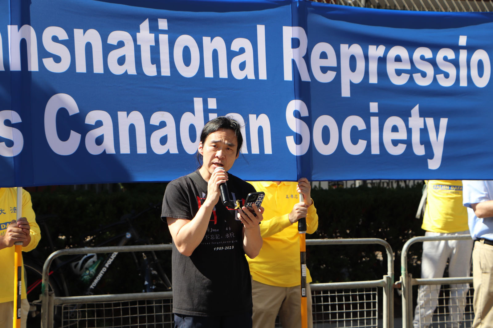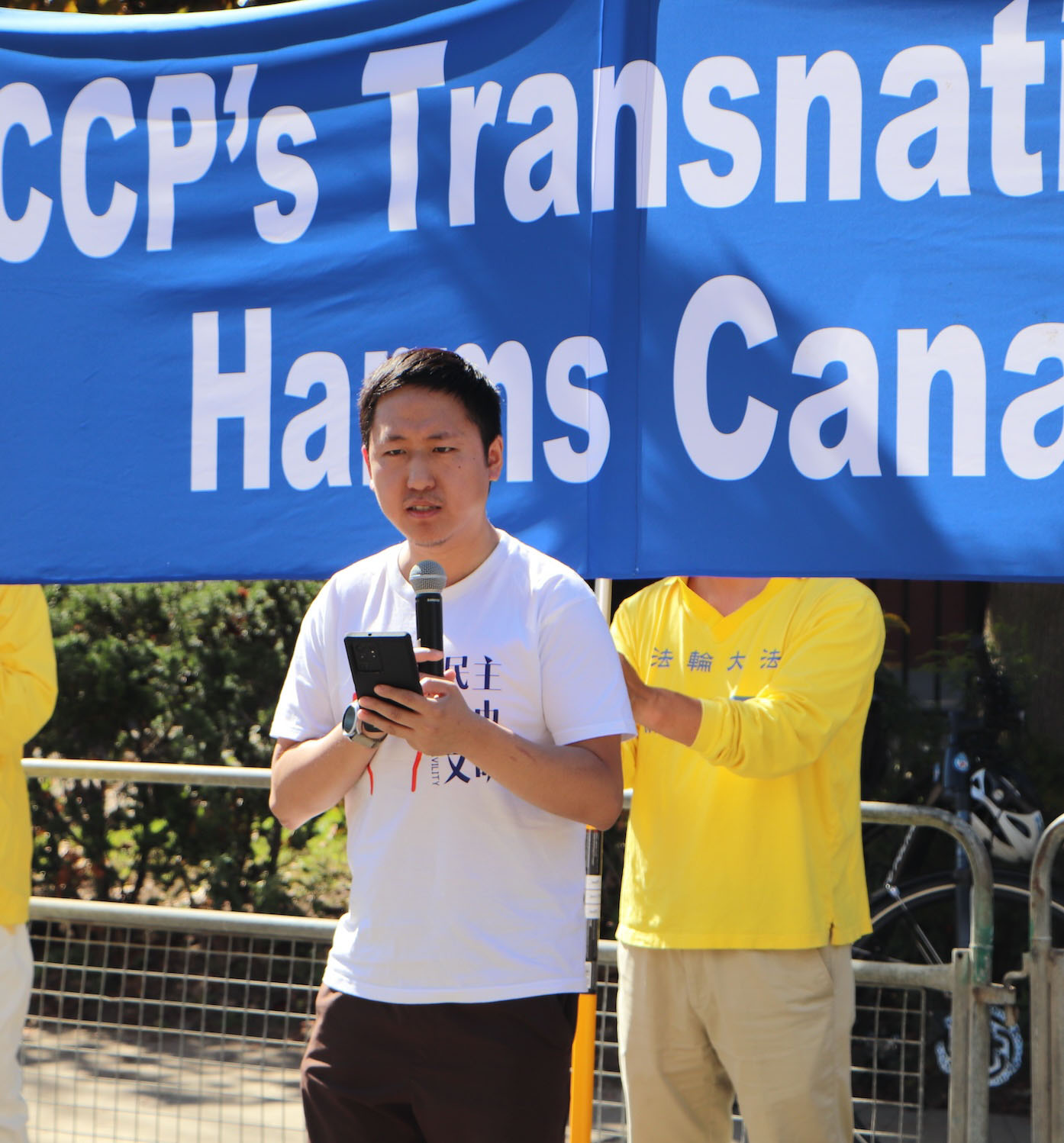 中国民主党加拿大委员会理事刘岩在集会上发言,他说:“我们有权利自由地表达观点;我们有权利追求真、善、忍的信仰;我们有权利批判独裁;我们有权利反对中共;我们有权利享受自由、民主和生而为人的尊严。”他呼吁各界团结起来,反对中共的渗透,反对跨国镇压,捍卫自由。