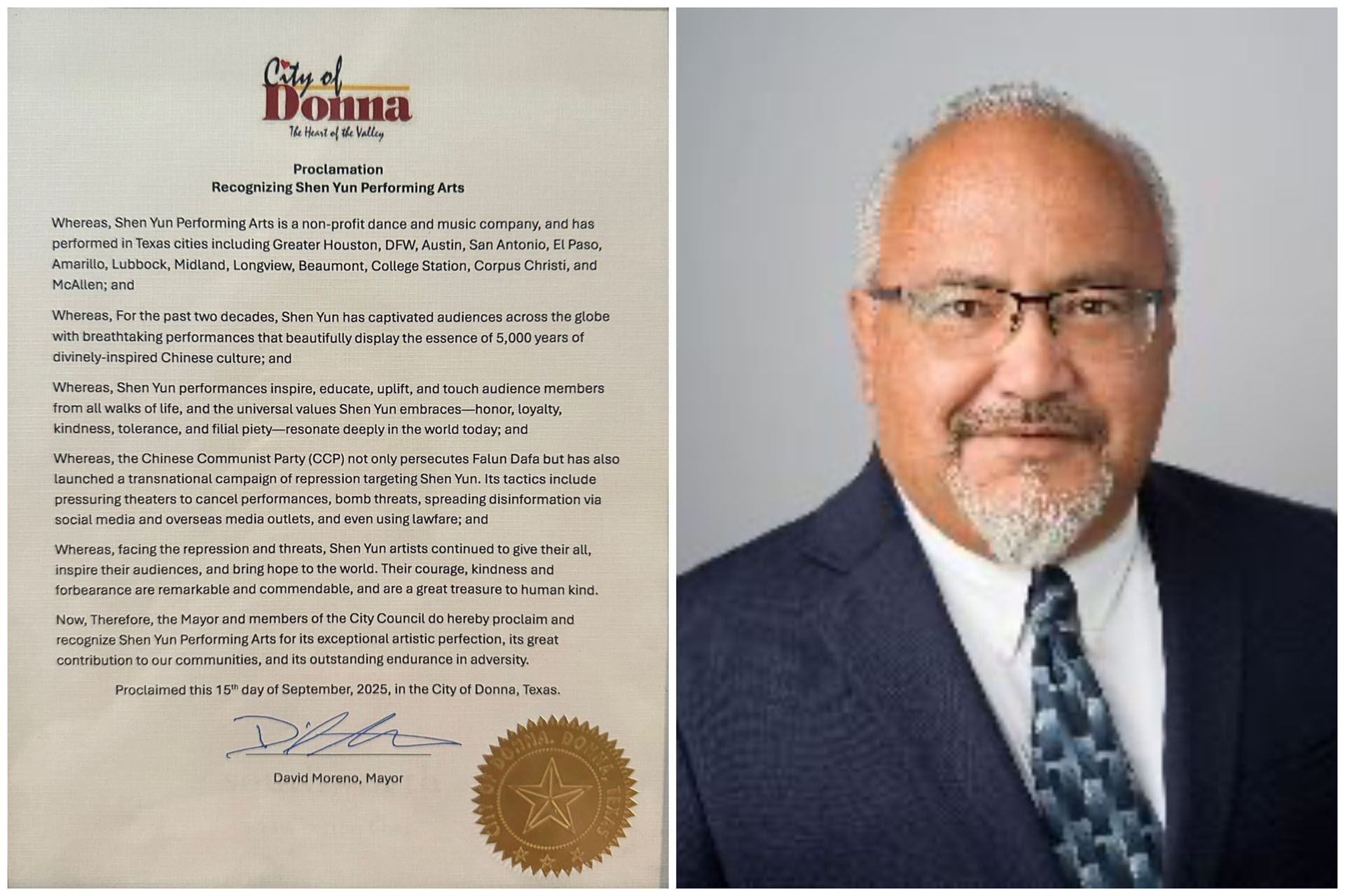 ![]() 图2:二零二五年九月十五日,德克萨斯州唐纳市市长大卫·莫雷诺(David Moreno)褒奖神韵。 |