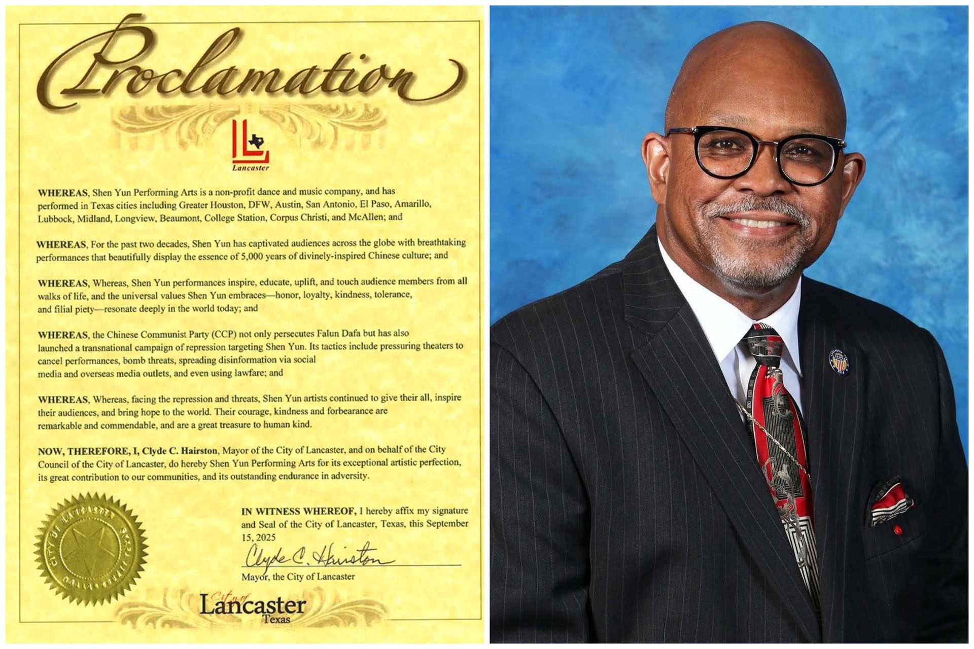![]() 图3:二零二五年九月十五日,德克萨斯州兰卡斯特市市长克莱德·C·海尔斯顿(Clyde C. Hairston)向神韵颁发褒奖。 |
