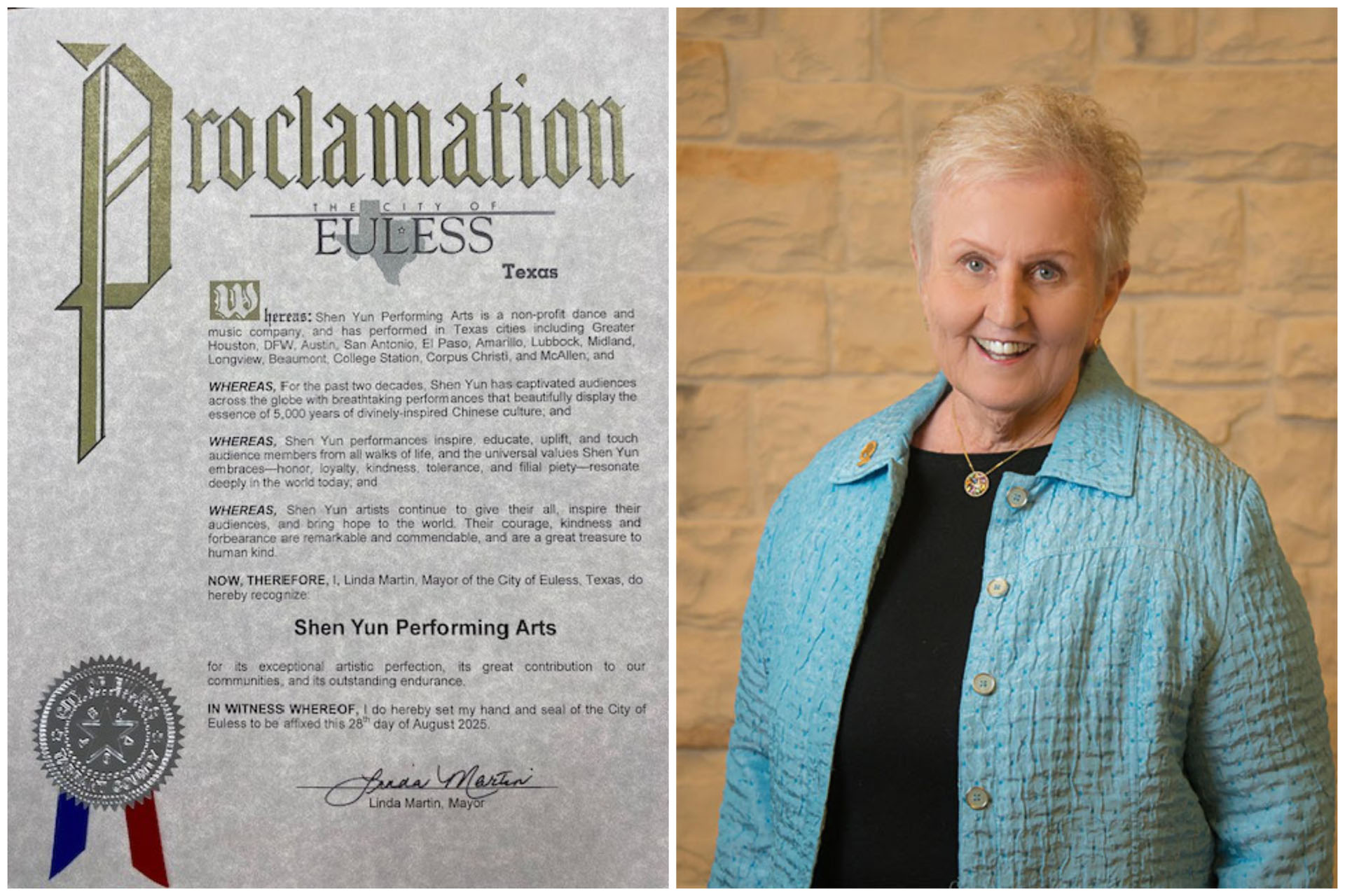 ![]() 图4:二零二五年八月二十八日,德克萨斯州尤勒斯市市长琳达·马丁(Linda Martin)向神韵颁发褒奖。 |