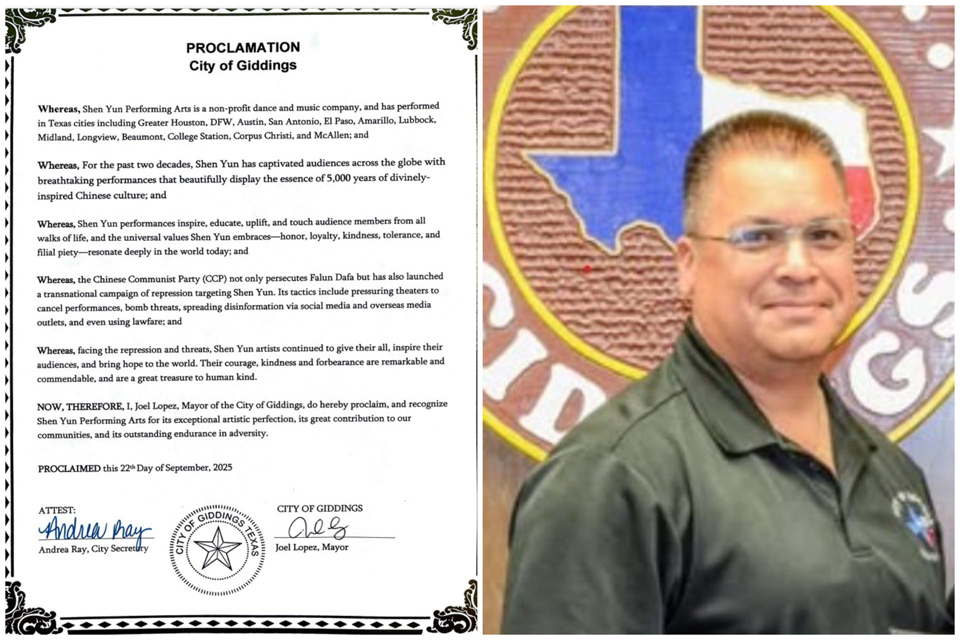 二零二五年九月二十二日,美国德克萨斯州吉丁斯市(Giddings)市长乔·洛佩兹(Joel Lopez)为神韵艺术团颁发褒奖,表彰神韵以精妙绝伦的演出展现了神传文化的精髓,造福着社区与国家,也赞扬神韵艺术家们面对中共跨国镇压时展现出勇气与善良,是人类宝贵的精神财富。