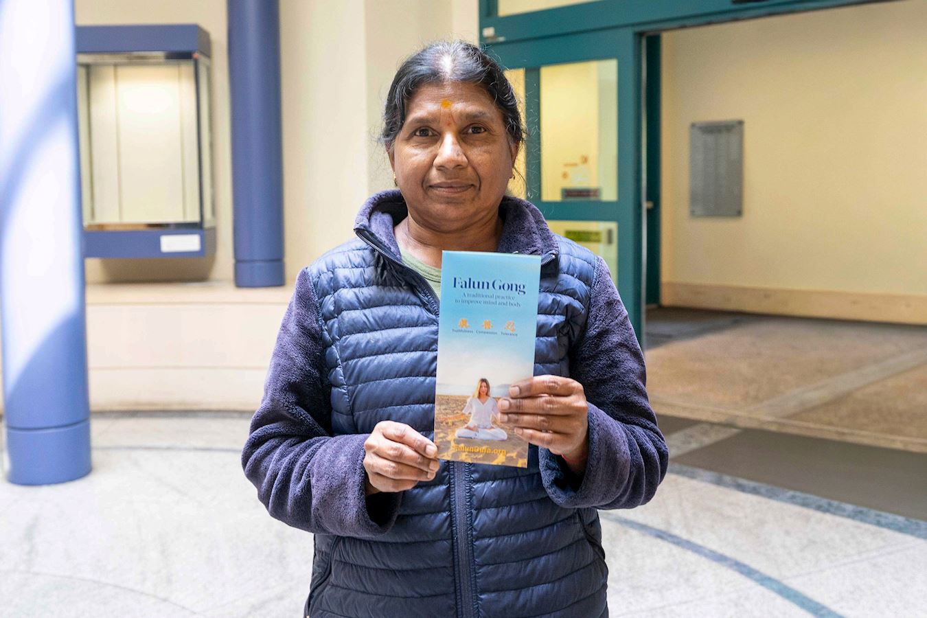 印度裔居民莫希尼(Mohini)很高兴有机会学法轮功,“我喜欢今天的教功班,这是我第一次参加法轮功教功班,我感觉非常好,感受到能量,感受到慈悲的力量,我变得安静,变得有神了。”
