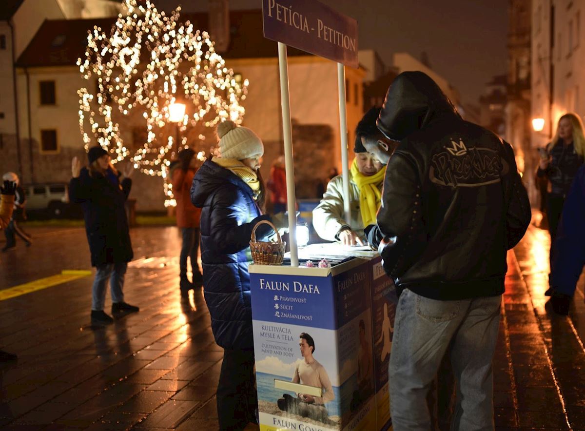 在布拉迪斯拉发,一位签名的老人将中国共产党迫害法轮功,与历史上其它群体遭受迫害的经历联系在一起,例如犹太人群体。巧合的是,该活动地点位于布拉迪斯拉发旧城的维德里察门(Vydrica Gate)附近,这里曾是犹太人社区所在地,如今也设有纪念碑。