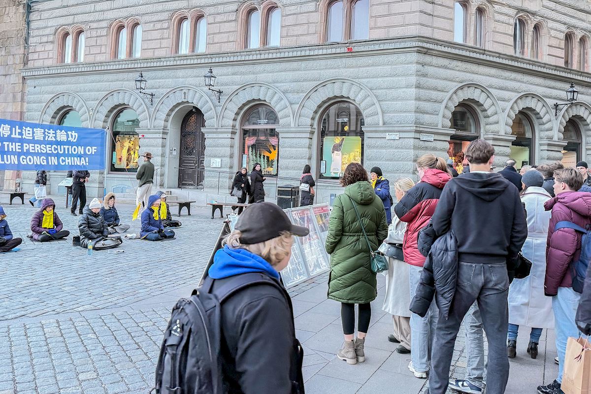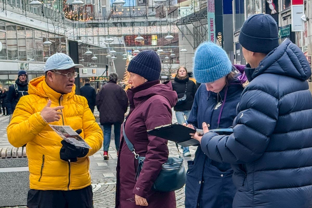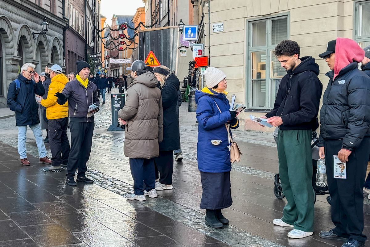 二零二五年十二月份每个周五和周六下午,法轮功学员分别在斯德哥尔摩最热闹的皇宫旁的钱币广场、著名的斯德哥尔摩音乐厅旁举办了法轮功功法演示、讲真相和征签活动。他们希望借助这个特殊的时刻,向更多人揭露中共对大陆法轮功学员的迫害和企图延伸至海外跨国镇压的罪行。