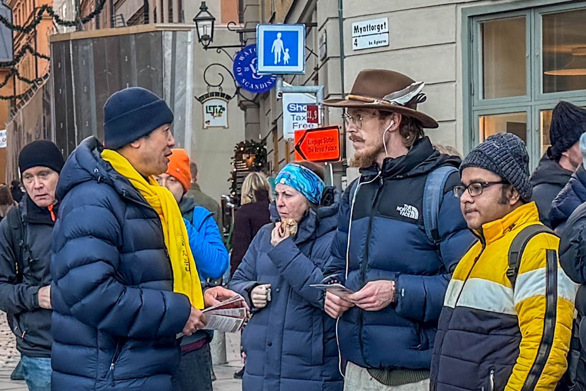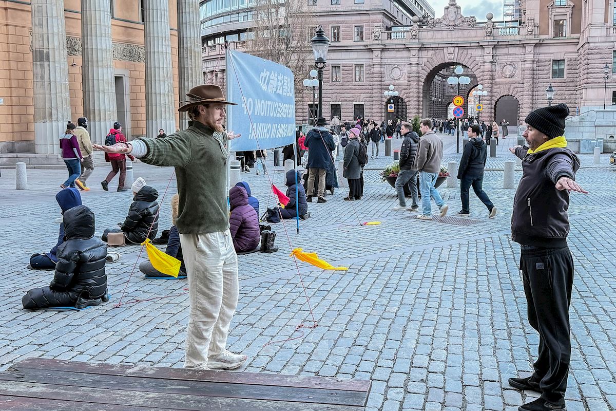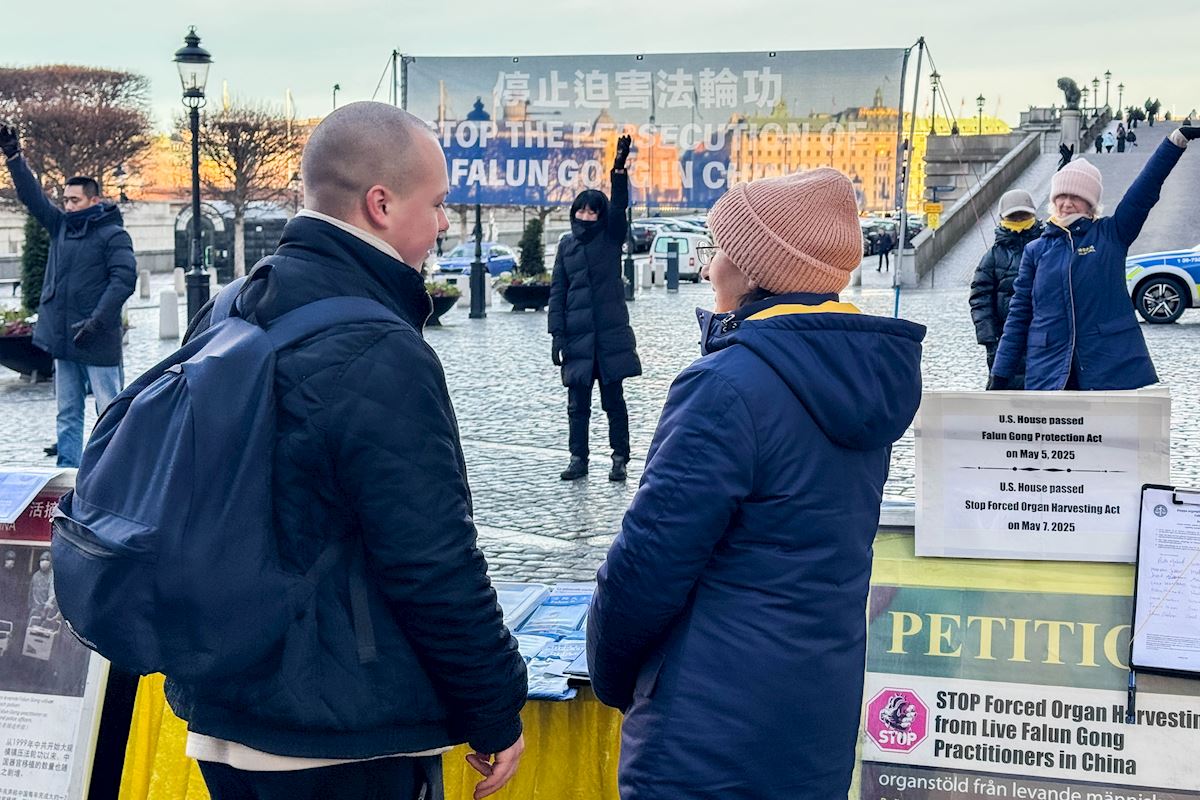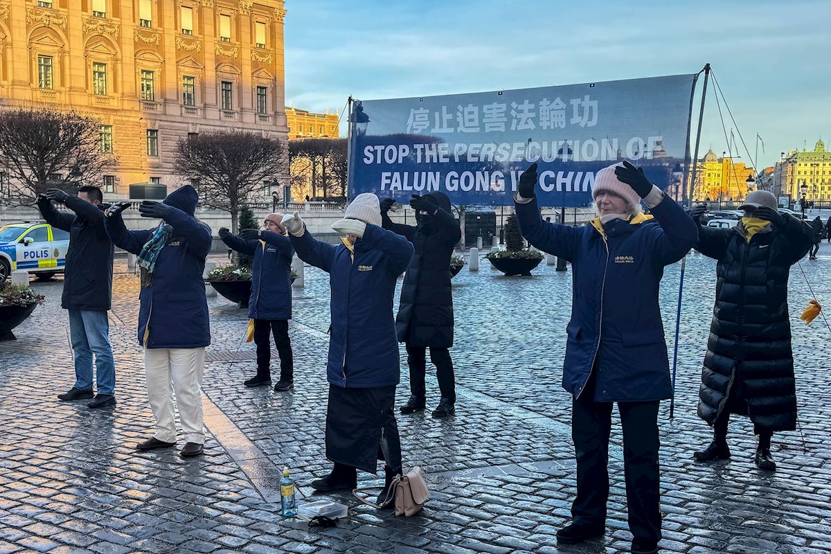 二零二五年十二月份每个周五和周六下午,法轮功学员分别在斯德哥尔摩最热闹的皇宫旁的钱币广场、著名的斯德哥尔摩音乐厅旁举办了法轮功功法演示、讲真相和征签活动。他们希望借助这个特殊的时刻,向更多人揭露中共对大陆法轮功学员的迫害和企图延伸至海外跨国镇压的罪行。