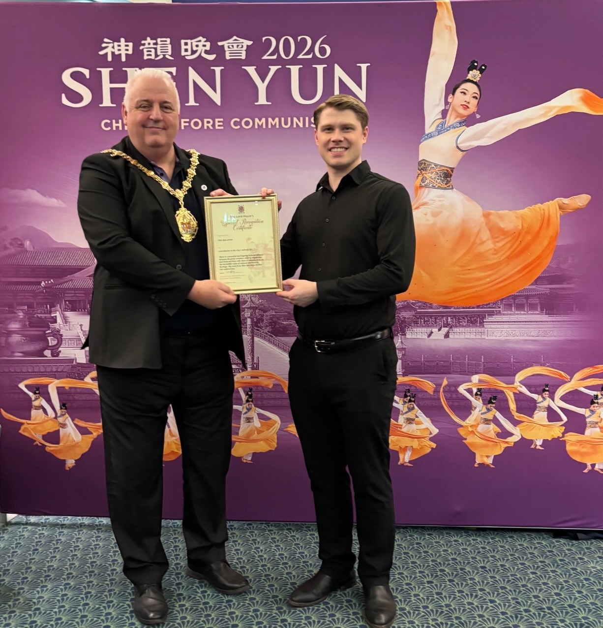 【明慧网二零二六年二月二十日】(明慧网英国记者站报道)二零二六年二月十八日下午,英国斯托克-特伦特市(Stoke-on-Trent)市长史蒂夫·沃特金斯(Steve Watkins)携夫人出席了神韵艺术团在摄政剧院的第二场演出。演出结束后,沃特金斯市长向神韵艺术团颁发了市长特别表彰证书,以表彰其对本市文化生活作出的杰出贡献。