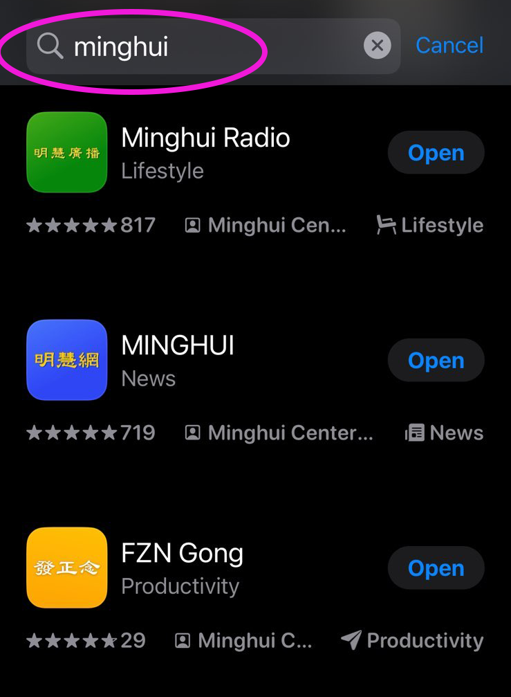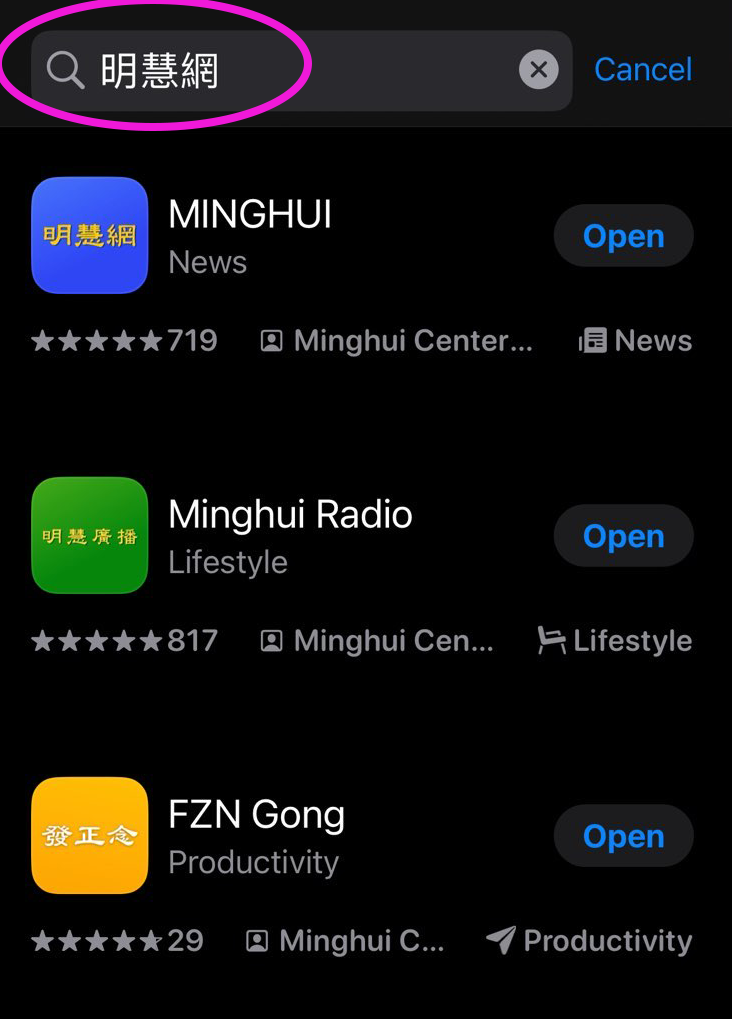 在海外的用户,到苹果应用软件商店(App Store)搜索关键字“明慧网”或“Minghui”,就可找到并下载明慧网App。因中共的迫害仍在持续,监控猖狂,出于安全考量,仅限海外使用,中国大陆法轮功学员慎用。